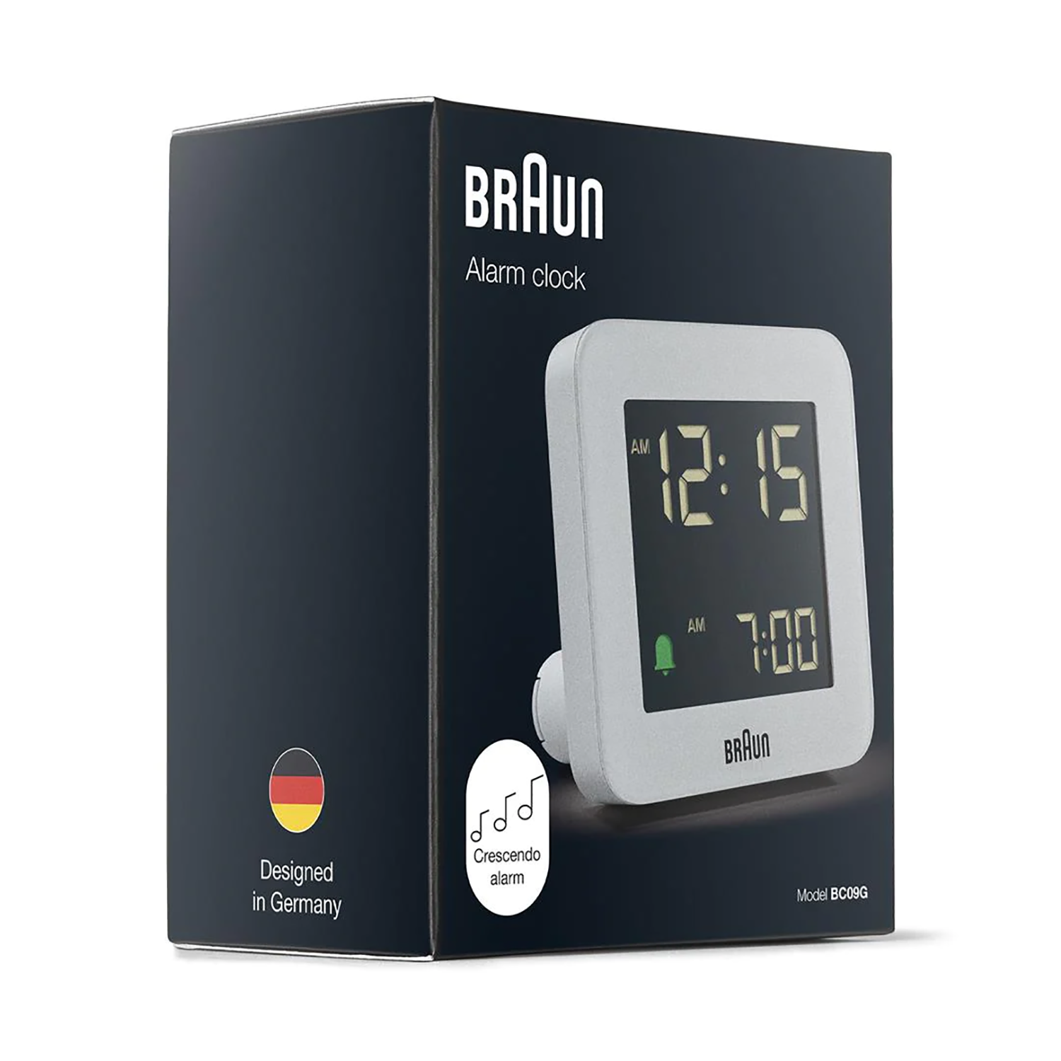- BC09 ma alarm dźwiękowy crescendo, funkcję drzemki i podświetlenia oraz wyświetlacz LCD z opcjami ustawień 12-godzinnych i 24-godzinnych, co poprawia funkcjonalność tego zegara. Projekt odzwierciedla zasady spójności, prostoty i przejrzystości projektu marki Braun.