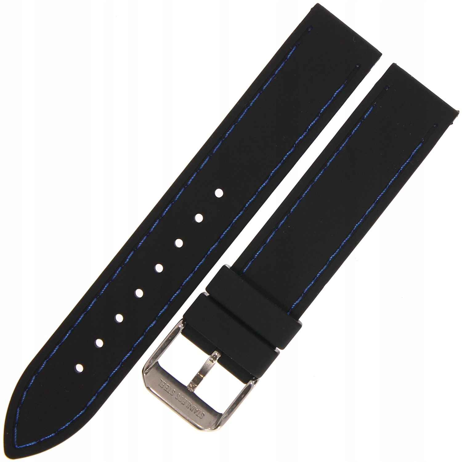 Pasek silikonowy, w kolorze czarnym z przeszyciem w kolorze niebieskim i ozdobnym perforowaniem.
