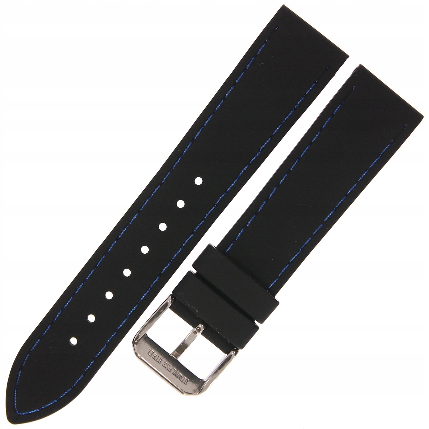 Pasek silikonowy, w kolorze czarnym z przeszyciem w kolorze niebieskim i ozdobnym perforowaniem.