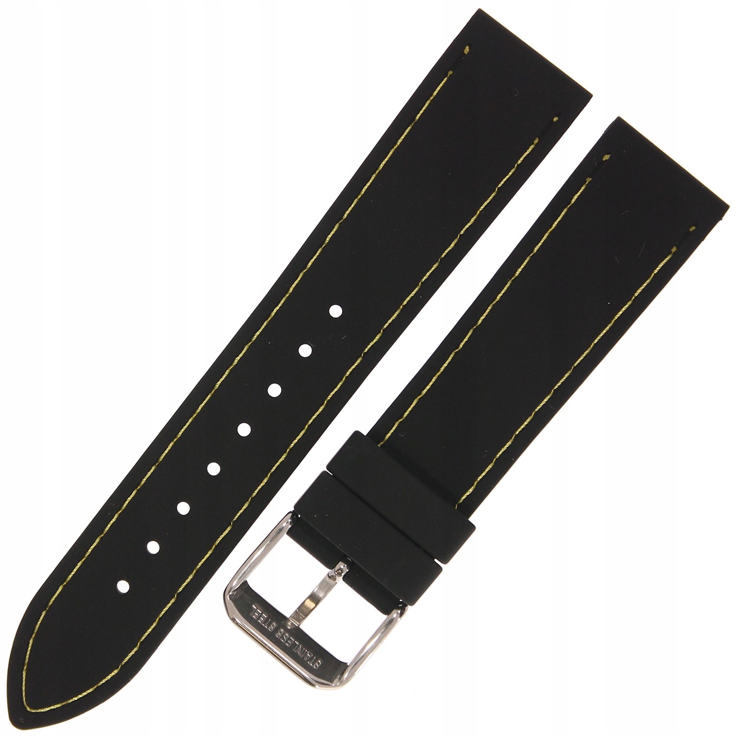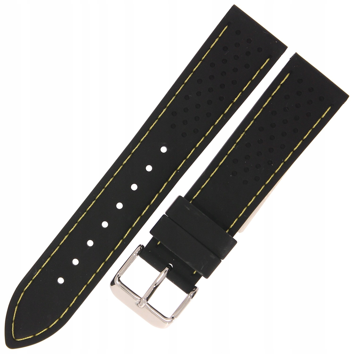 Pasek silikonowy, w kolorze czarnym z przeszyciem w kolorze żółtym i ozdobnym perforowaniem.