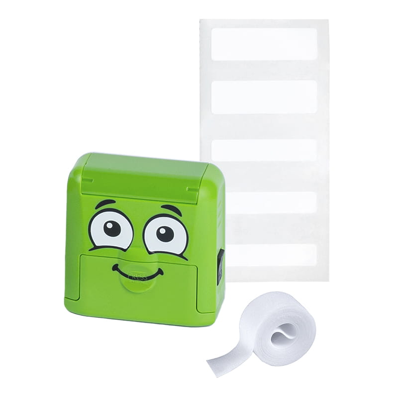 - Specjalnie opracowany wodoodporny tusz wytrzymuje wielokrotne pranie, niezależnie od tego, czy stempluje się bezpośrednio na jasnych tkaninach, czy na dołączonej taśmie do naprasowywania w przypadku ciemnych tkanin. Specjalnie powlekane etykiety MARKY pomagają personalizować niechłonne materiały i można je w 100% myć w zmywarce.