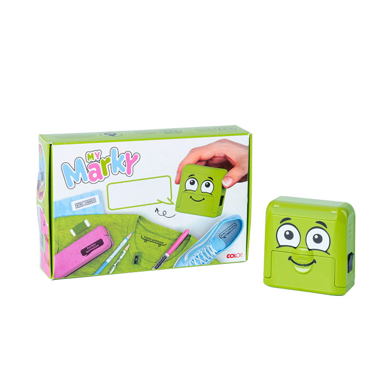 - MARKY nadaje się do tekstyliów dziecięcych, sprzętu sportowego, przyborów szkolnych, obuwia i wszystkich powierzchni chłonnych. Pieczątka MY MARKY jest wyposażona w zintegrowaną poduszkę, która zawiera specjalistyczny wodoodporny tusz do tekstyliów i pozwala na wykonanie do 1000 odbić.